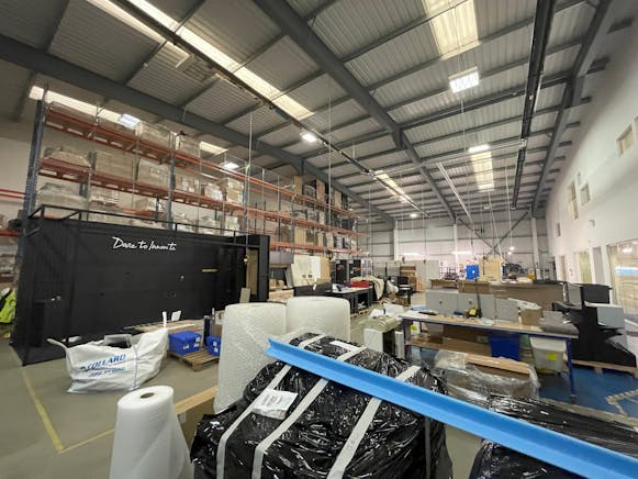 The unit benefits from steel portal frame construction with 6m clear internal height, a dedicated service yard with 17.5m depth and substantial car parking.